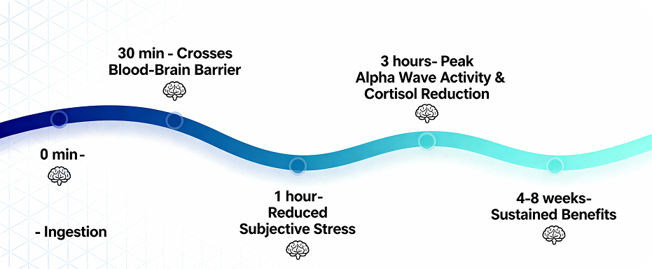 Crosses the blood-brain barrier in 30 minutes. Reduces cortisol response and increases alpha brain waves (8-13 Hz) for "relaxed alertness"—calm focus without sedation.